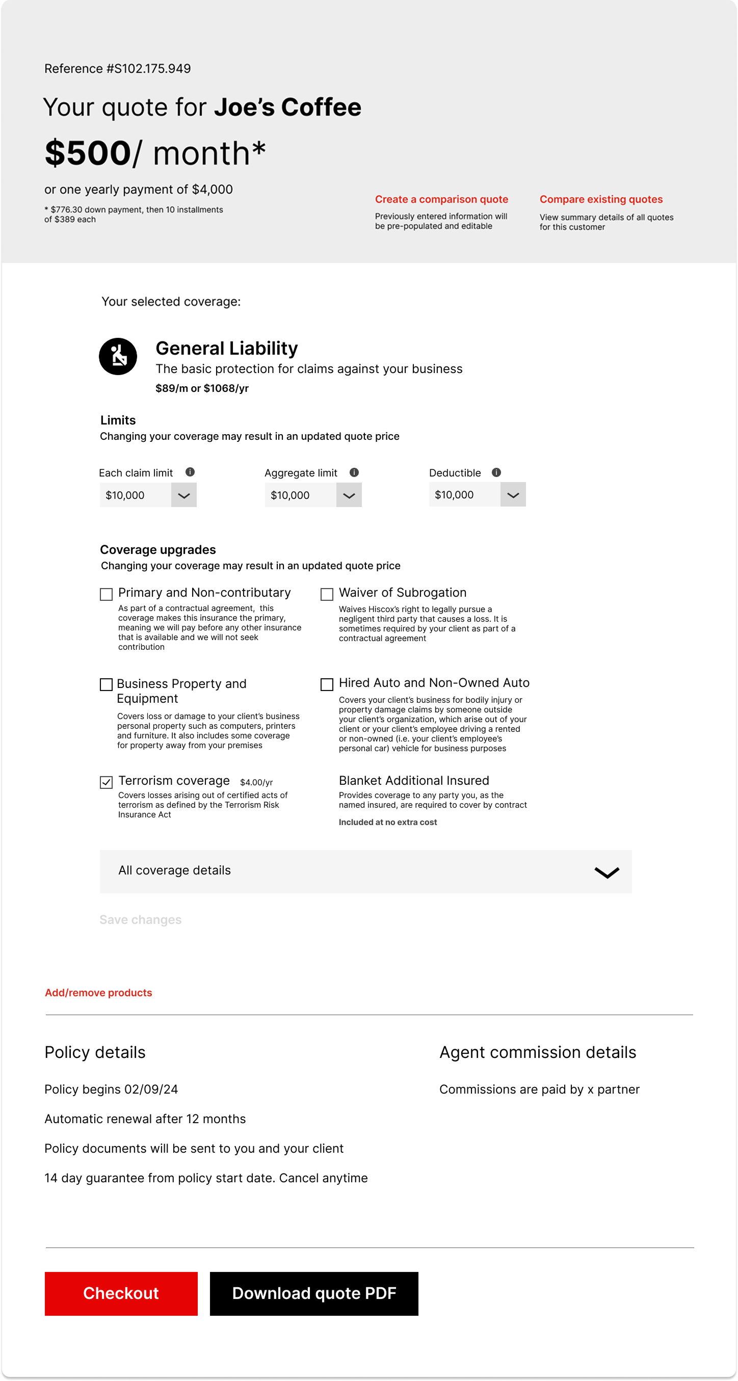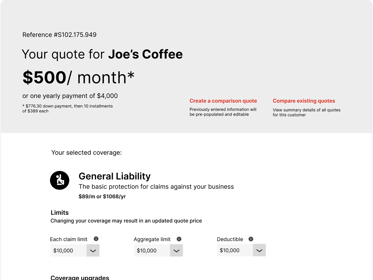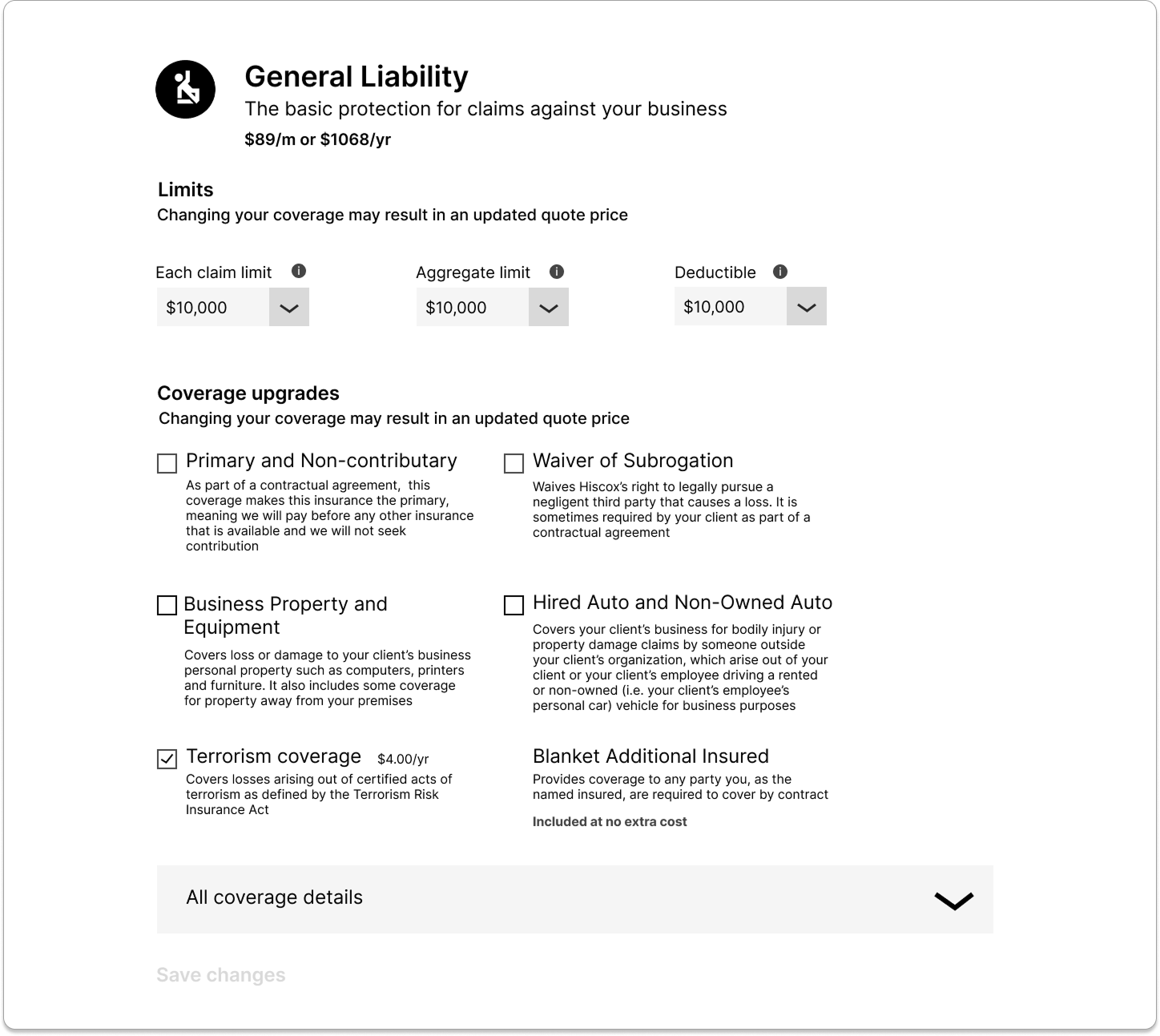 Business owners struggled to find the coverage upgrades they needed to fully insure their business. I led the design of an updated experience from start to finish, balancing business requirements, technical limitations, and UX best practices.